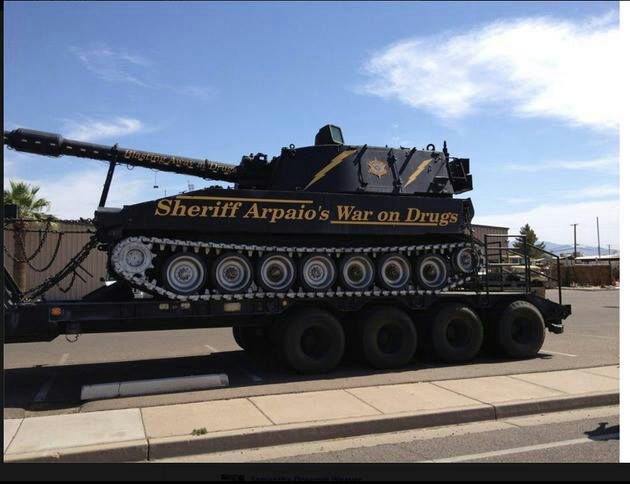 Hombre, no pasa nada porque vayamos al Mercadona con un carro, pero este pedazo de animal de sheriff americano de Arapaio´s, se las gasta guapas en su "lucha", contra los drogatas de su pueblo. nada menos que un ATP M109.