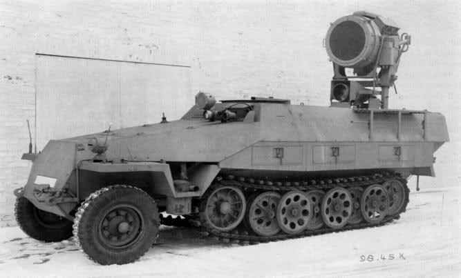Pero los alemanes también tenían en marcha su sistema de infrarrojos, que en este caso, era un “binomio” formado por el semioruga Anomag Sd.Kfz.25120 Ausf.D UHU como vehículo “iluminador” y el carro de combate Sd.Kfz.268 Pz-BfWg V Ausf.G Phanter. En este caso era el Anomag el que iluminaba el campo de batalla y el carro “visualizaba” el haz de luz “negra” mediante sus visores. Resulto bastante efectivo. (imágenes 002 y 003)