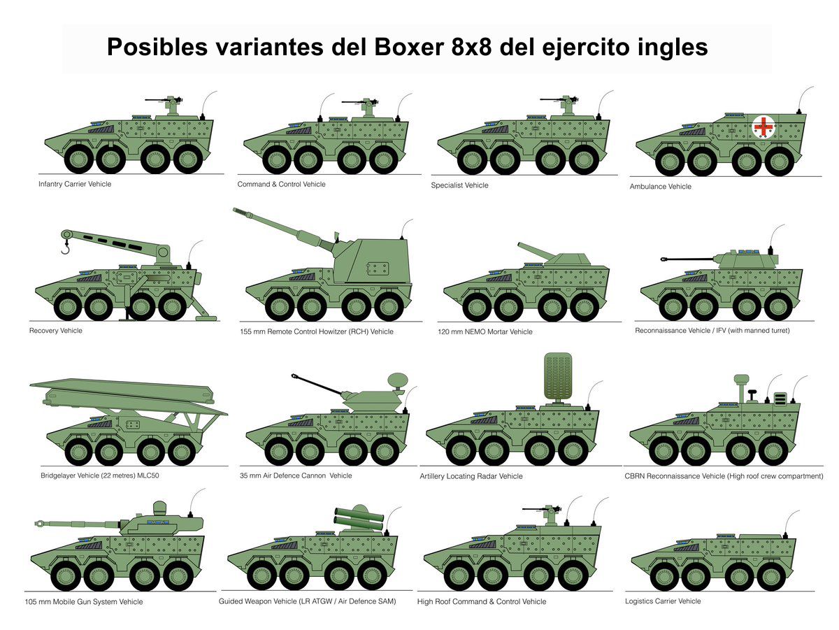 Inglaterra. Los ingleses han adquirido inicialmente el Boxer 8x8 alemán en las siguientes 4 variantes, el : Vehículo de Infantería Mecanizado (MIV), el Vehículo de Infantería Mecanizada de Movilidad Protegida (MIV-PM), el Vehículo de Infantería Mecanizada para Comando y Control (MIV-CC), la Ambulancia Blindada (MIV-A) y el Vehículo de Infantería Mecanizado para Reparación y Recuperación (MIV-REC). Os pongo la imagen tipo poster, con todas las variantes que los ingleses quieren tener del Boxer 8x8