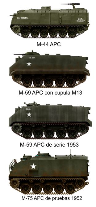 Ya en los 50, los americanos desarrollan los primeros TOAs o APCs, propiamente dicho, los M-39, M-44, M-59, M75 y lógicamente el incombustible M-113 y su hermano pequeño M-114 pero este mas de reconocimiento. Los M-39 y M-75 fueron los que formaron las primeras unidades mecanizadas hasta la llegada del M-113. Pocas variantes se hicieron del 39 y 75, ya que fueron básicamente transportes y además el M-75 al ser muy grande fue reemplazado por el M-59 más pequeño y barato que fue el que realmente formo la columna vertebral de las unidades mecanizadas. Al M-44 le paso lo mismo, muy grandote lo que motivo su pronto retiro y solo se uso en pocos trabajos auxiliares.