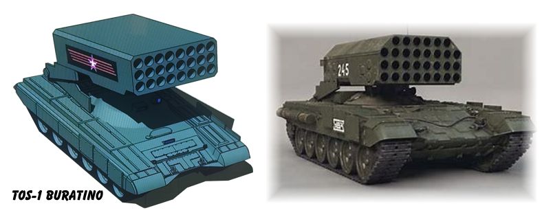 Vehículos MLRS sistema de cohetería múltiple. Los TOS-1 Buratino con 24 alveolos, el TOS-1M Buratino con 30 alveolos y el TOS-3 Dragon con 30 alveolos.