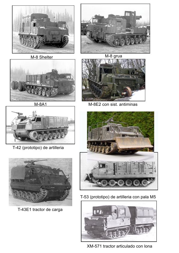 Sigo. Estados Unidos actualmente no dispone de nada parecido. En los 50-70 disponía de los tractores de artillería y multifunción M-8, T-42, T-43E1 y E2, T-44, T-48, y T-53, todos ellos sobre el chasis del carro de combate M-48. También tenían un tractor articulado similar al modelo sueco, designación oficial XM-571, para transporte de tropas y material. Os pongo unas imágenes del material americano y el tractor XM-571.