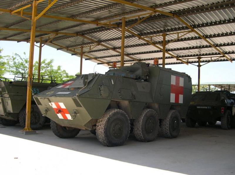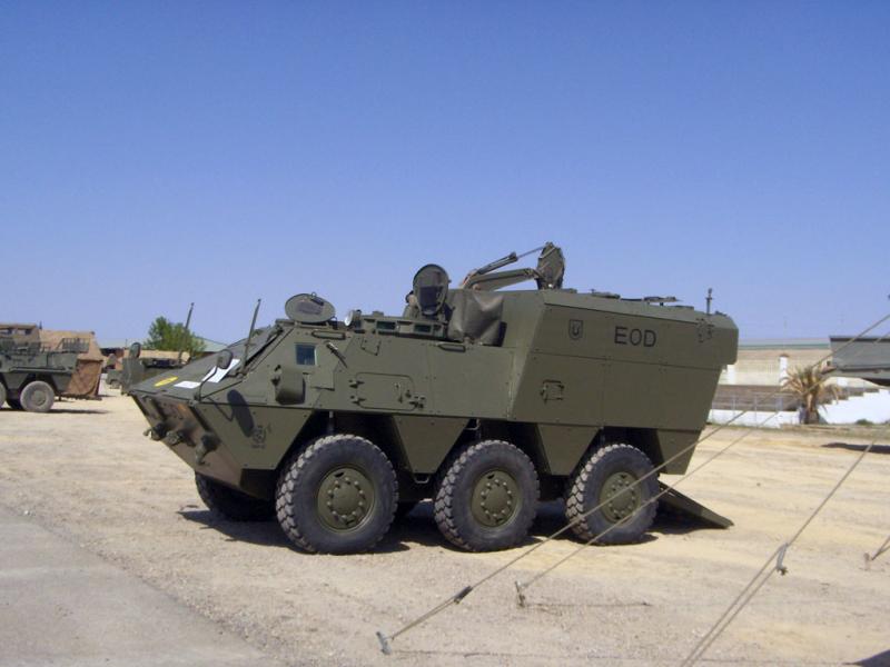 La segunda se supone que es la propuesta de Santa Bárbara para sustituir al LVTP-7 con un derivado del BMR, ignoro si es el muchas veces mencionado BMR-VMA (vehículo mecanizado anfibio). Por lo visto actualmente o al menos en el momento de hacer la foto estaba como monumento en el cuartel de la compañía de IM de la Guardia Real.