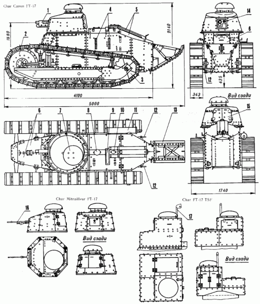 Carro de combate ligero de 6,7 Tm, modelo de 1917, con una velocidad máxima en carretera de 8 km/h. Sus dimensiones eran de 4,94 metros de largo, 1, 74 m de ancho y 2,14 de alto. Estaba dotado en un cañón Puteaux de 37 mm. el casco del carro FT-17 era una simple caja blindada con un estrechamiento en la parte de atrás. El motor, un Renault de 35 cv, estaba situado en la parte trasera. La alimentación se hacía con ayuda de bombas, y sus dos depósitos tenían una capacidad de 100 l. La transmisión comprendía un embrague y caja de velocidades Renault, con cuatro marchas de velocidad y una marcha atrás. La refrigeración se hacía por agua y se podía acceder al motor por un portón trasero encima del casco. La cámara de combate y la de conducción ocupaban la delantera. La tripulación accedía al interior por dos puertas en la parte anterior. También había una salida en la trasera de la torre. El conductor estaba sentado en la delantera, justo detrás de la puerta de entrada. Su asiento estaba a nivel del suelo y podía ver a través de tres mirillas con una contraventana abatible. Sus mandos eran una palanca de cambios a la derecha y dos de dirección a la izquierda. El jefe del vehículo-tirador se encontraba en la torre, en el centro del vehículo, y podía estar sentado o sobre un pequeño asiento. Tenía cinco mirillas para la visión y podía girar la torre manualmente. La cámara de motor estaba separada de la de combate por un mamparo cortafuegos. La munición estaba alojada debajo de la torre y a lo largo de las paredes de la misma. Las cadenas se regulaban por dos poleas de tensión en la parte delantera. Tenía cuatro conjuntos de ruedas de rodaje: el primero de tres y los tres siguientes de dos. Todos iban montados sobre una viga longitudinal. La tracción se realizaba por una rueda dentada en la trasera, y en la parte superior tenía seis pequeños rodillos de vuelta.