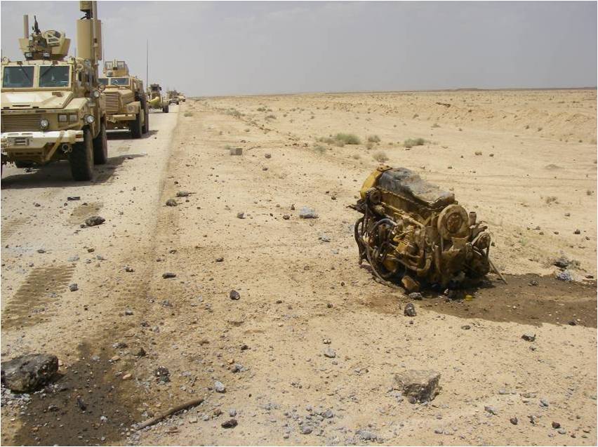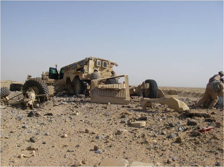 En lo referente a la explosion y el estado del MRAP. Yo no creo que fueron 500kilos, ni tampoco 250, que es lo que se comenta en diversas publicaciones, estas cantidades de explosivo, aunque se trate de material de baja velocidad de detonacion como el nitrato de amonio, harian desintegrar este vehiculo casi en moleculas en caso de producirse la explosion en cercania directa al MRAP, y si tenemos en cuenta que todos estos insurjentes ya utilizan hasta RDX para sus atentados, seria suficiente como para hundir un portaaviones con un poco de suerte. Asi a ojo y sin saber distancia exacta, pero suponiendo que se haya producido a 2-3m en diagonal hacia parte delantera del vehiculo, diria que son entre 35 y 45kg de explosivo equivalente a TNT. Por ejemplo RG-31 con 20kg de amatol bajo su chasis no lo podria aguantar de ningun modo, este Cougar es mas protegido pero no como para hablar de cientos de kilos, esto no lo soporta ningun carro blindado y media tonelada ya es demasiado incluso para muchos buques acorrazados.