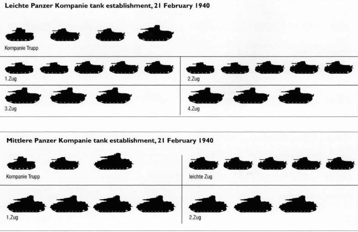 Como puedes ver en la imagen de las plantillas que te mando de una compañía Panzer tanto ligera como media, fíjate en el año y veras – y tú lo sabes bien – que esta plantilla es fiel reflejo de la falta de materiales, ya que Alemania en ese año no disponía todavía de la suficiente cantidad de carros medios para hacer compañías al completo del mismo tipo de vehículo y lo que se buscaba era tener el mayor numero de divisiones.