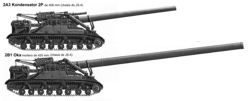 En concreto son los monstruosos 2A3 Kondensator 2P de 406 mm y el 2B1 Oka mortero de 420 mm., y no estoy seguro si son chasis del T-100, del JS-4/5 reforzados o del ISU-122 modificado?.