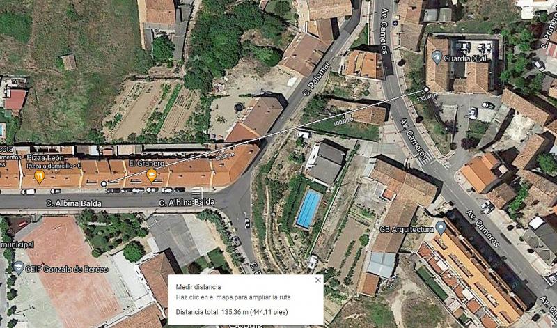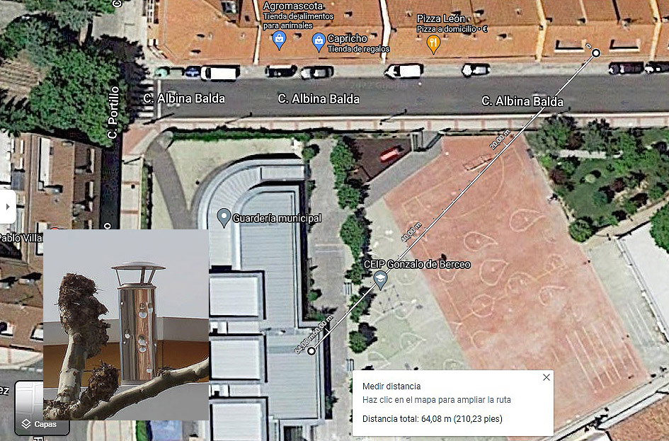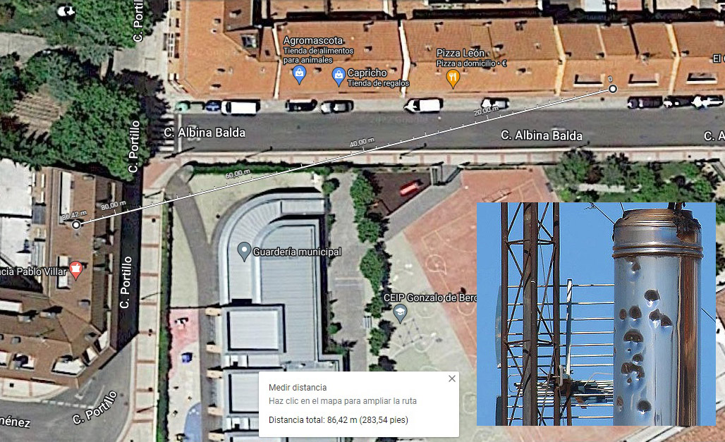 Me ha costado buen rato encontrar la chimenea que tiene detrás la torreta de antenas en dirección del tiro. Lo más plausible es el edificio calle abajo, hacia poniente a una buena distancia de unos 85 metros.
