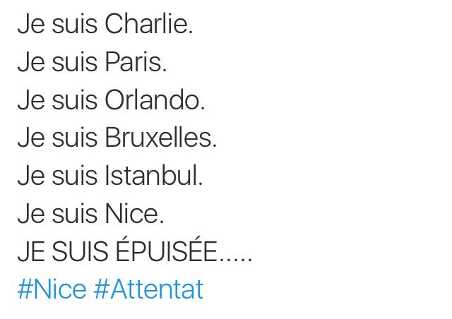 Mis condolencias ante este cobarde atentado contra las libertades, ¡las víctima estaban viendo los fuegos artificiales del 14 de Julio!, de ahí la aglomeración de personas, hombres, mujeres y niños en un mismo punto.