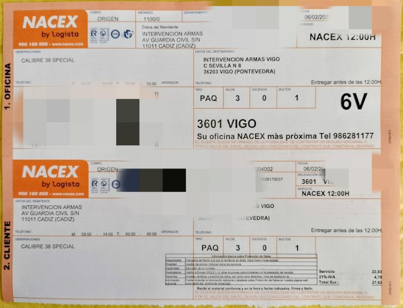 Esta información me la han dado hoy mismo en NACEX de Las Rozas, pues hoy mismo he contratado un servicio de transporte Arma Corta para recoger en LAS ROZAS y depositar en ALICANTE. (Es el arma de un amigo que se la vende a otro amigo)