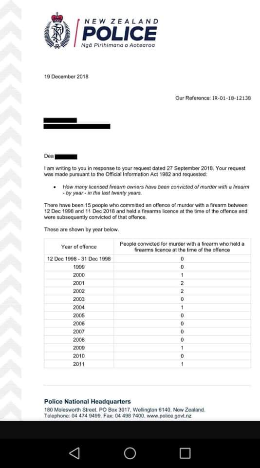 Aqui esta la friolera estadistica de muertes en Nueva Zelanda en los ultimos años por poseedores legales de armas........ se ve claramente el porque se han tenido que restringuir sus derechos.........
