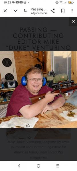 Era Mike "Duke" Venturino, periodista, cazador, recargador, tirador de competición con pólvora negra, conservacionista, entendido en armas del S. XIX, escritor y muchas cosas más. Reconozco que buena parte de lo que sé lo aprendí leyéndole. Estudió periodismo y desde el primer día quiso dedicarse a escribir sobre armas, así que ha escrito en las mejores revistas norteamericanas medio siglo.