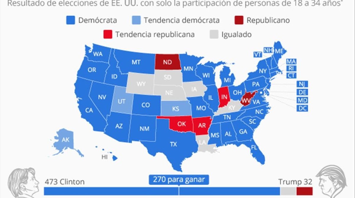 Una/un político/política de podemos/podemas puso en un tuit un mapa de las elecciones USA en que todo estaba en azul, se trataba de una proyección de resultados si solo hubiesen votado menores de 34 años y con un epíteto... "solo es cuestión de tiempo"