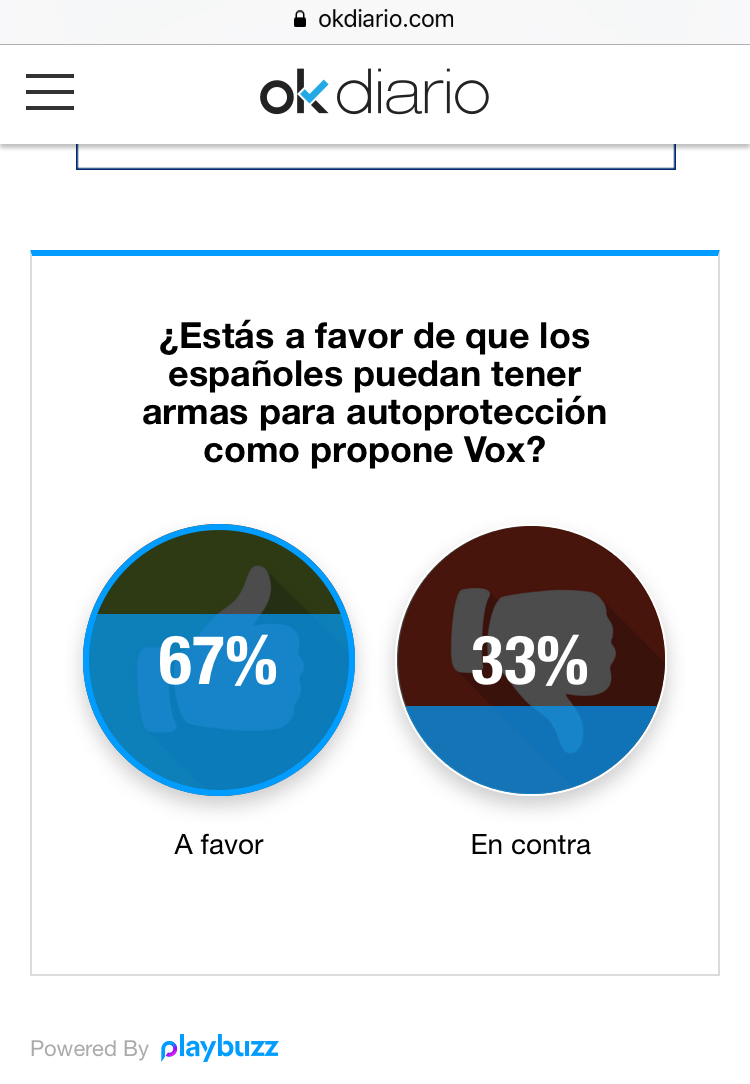 Creo que el numero de votantes, es una ínfima minoría, y tengo serias dudas, de que si fuese un referéndum a nivel nacional, saliese lo mismo. Somos unos 40 millones de españoles, y creo que muchos no piensan con claridad ciertas cosas, influidas por los medios de comunicación, y el buen rollismo reinante, y mas cuando los varones de este país, han perdido hace décadas cualquier toma de contacto con un arma en su vida, como era hacer la mili, para darse cuenta, de que al final, no son mas que una simples herramientas, para un fin, y creo que muchas, tienen la firme creencia, de que se disparan solas, y cosas así......