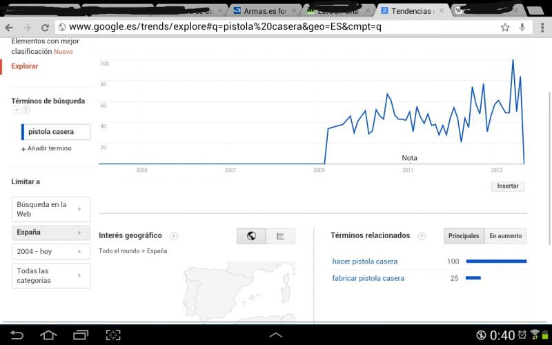 Trasteando tendencias de google, se me ha ocurrido poner "pistola casera" resulta que hay un interes creciente. Imagino que la sensacion de payoso indefenso tiene mucho que ver.