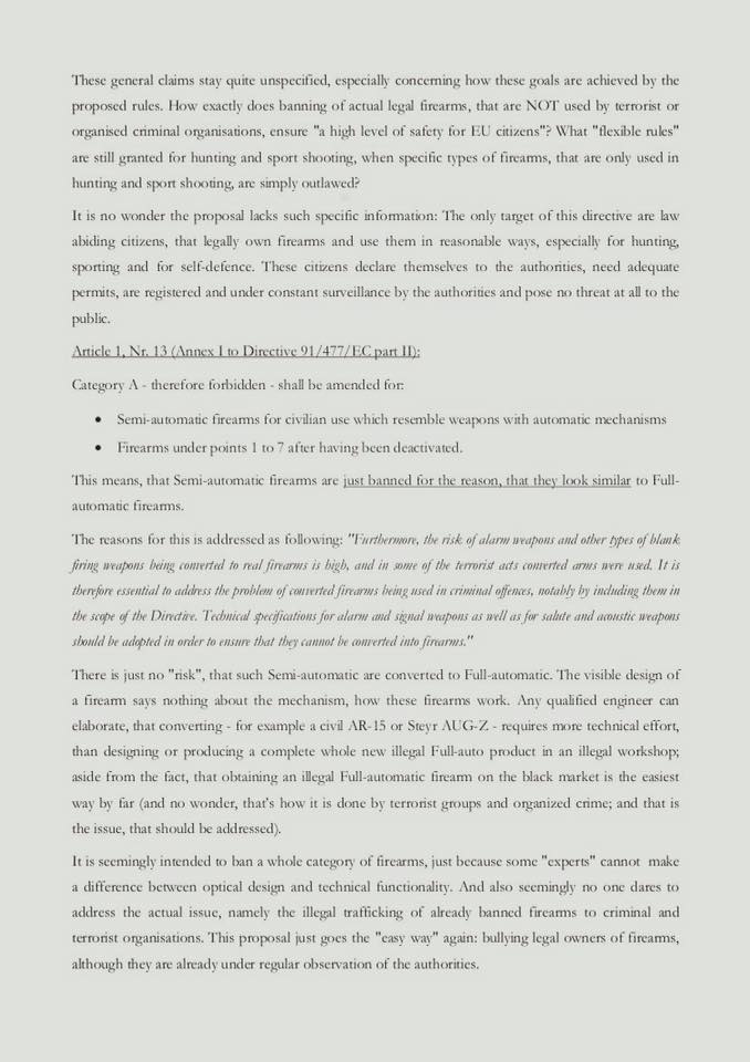 1.- En todos los países de la UE, y ESPECIALMENTE en España ya existe una regulación excesiva del derecho a la práctica deportiva y a la posesión de bienes NO dañinos como las armas legales. Y no empleo la expresión NO dañinos gratuitamente. Por favor tómese la molestia de averiguar el índice de actos delictivos realizados con armas legalmente adquiridas.