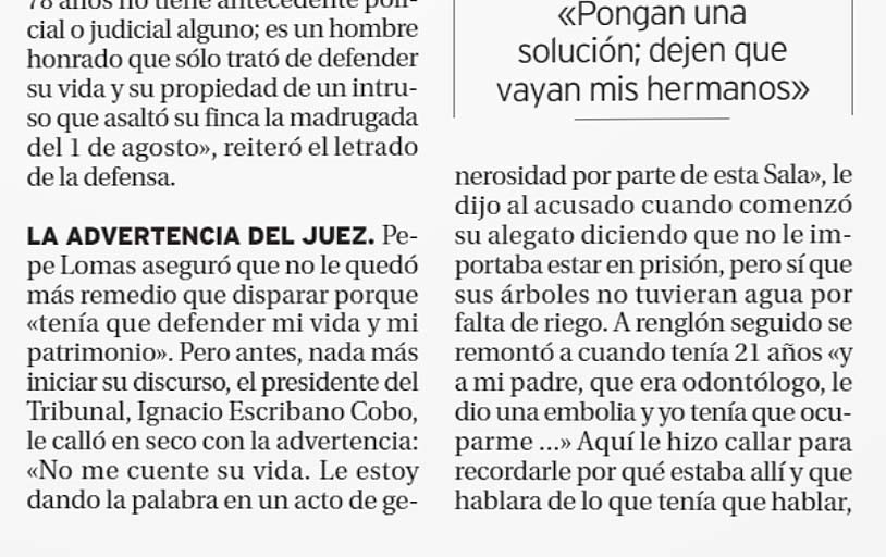 Es lo primero que le dice al juez, que sorprendido y molesto le suelta:”No me cuente su vida. Le estoy dando la palabra en un acto de generosidad por parte de esta sala”. Y el jubilado desde el banquillo de los acusados ante el cabreado juez vuelve a desafiarlo contándole que cuando tenía 21 años a su padre odontólogo le dio una embolia y tuvo que ocuparse de él. Y aquí ya el juez le hizo callar para recordarle que estaba allí para hablar de lo que tenía que hablar.