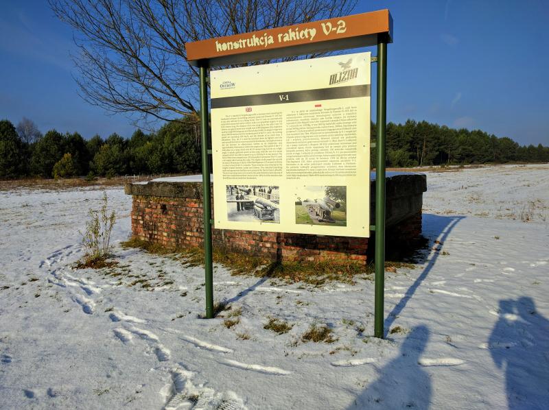 Una placa conmemorativa de Armi Krajowa, la resistencia polaca en la 2ª Guerra Mundial, los cuales realizaron sabotajes a estas instalaciones e incluso llegaron a capturar un cohete V2 que no explosiono, enviándolo a la inteligencia aliada.