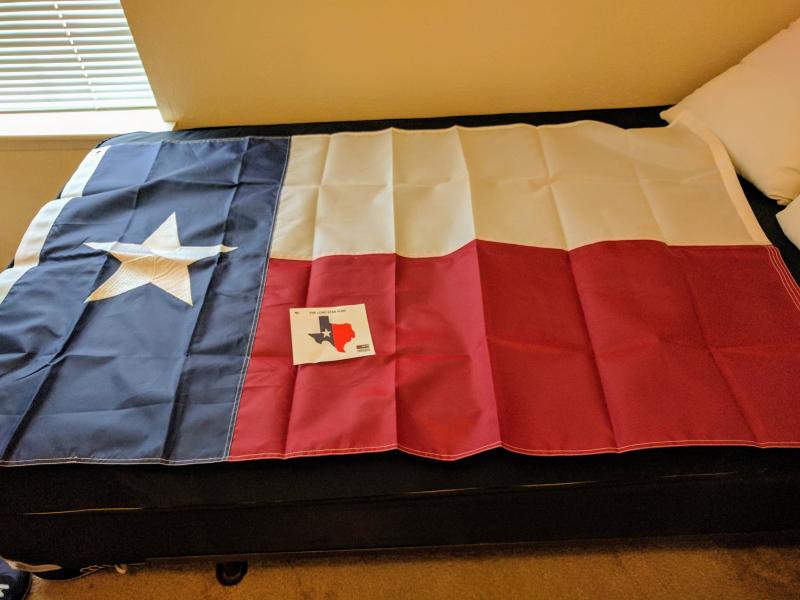 Lo que he hecho ha sido comprarme una pedazo de bandera de texas, hecha en USA (espero que no me la hayan colado) con la estrella solitaria bordada y materiales de primera calidad. Ahora estoy viendo como le quito esas rayas de haber estado doblada y en que parte de mi pared me la cuelgo.