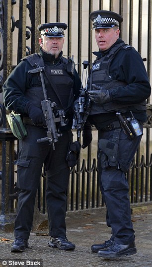 en zonas neuralgicas de Londres, como Victoria Station, en los aeropuertos, x estaciones de ferrocariles, edificios gubernamentales, la policia se pasea con Hk MP5´s y Glocks, aparte de coches patrulla armados hasta los dientes circulando por las ciudades neurálgicas británicas de modo que ante un percanze, en escasos minutos llega al lugar fuerza armada.