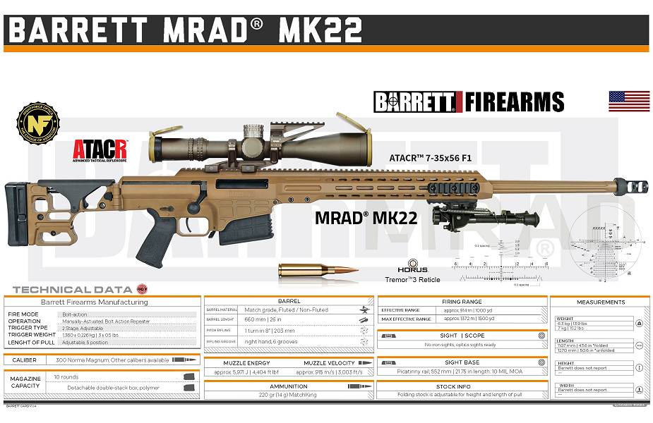 Además se desea comprar el MRAD Mk22 multicalibre (.338 Norma Magnum, .300 Norma Magnum y 7.62 × 51 NATO) para reemplazar el M107 calibre 50