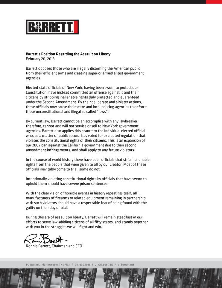 Según la ley actual, Barrett no puede ser cómplice de cualquier infractor de la ley, por lo tanto, no puede y no va a servir o vender a las agencias del gobierno de Nueva York. Barrett también se aplica esta postura al funcionario electo individuo que, como un asunto de interés público, ha votado a favor o creado regulación que viola los derechos constitucionales de sus ciudadanos. Esta es una expansión de nuestro prohibición de 2002 contra el gobierno de California debido a sus infracciones segunda enmienda, y se aplicará a los infractores en el futuro.