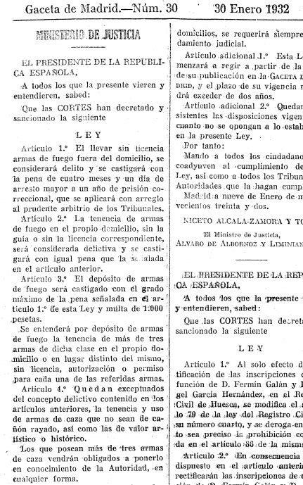 Un ejemplo de una ley de 1932 sobre el asunto, publicada en el BOE (que entonces se llamaba la Gaceta), podías haber comprado el arma fácilmente en una armería, pero si te detenían y no tenías permiso te caían estas penas: