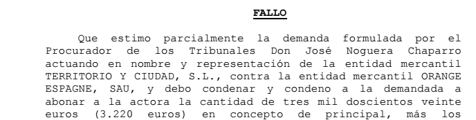 Hoy hemos recibido la primera sentencia indicando que dicho cargo no es correcto y obliga a Orange a devolverle cerca de 3.200 €.