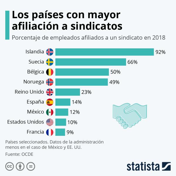 Un ejemplo más, numero de afiliados en sindicados (no todos privados) en algunos países: