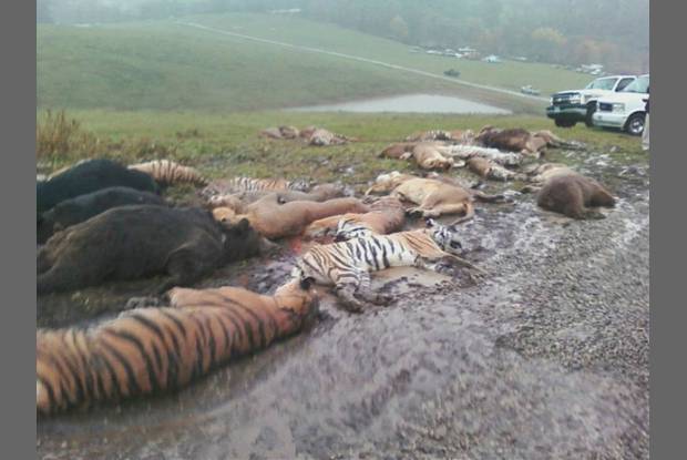 La verdad es que es tremendo matar a ese montón de animales, sobre todo habiendo entre ellos un montón de especies en peligro, como los tigres. Pero la cosa debía de correr prisa, el sheriff y sus ayudantes se encontraron la granja con un montón de animales aún sueltos por allí, no creo que les diese tiempo a ir a por armas anestésicas. No deja de ser un cuerpo de policía local de una pequeña localidad.