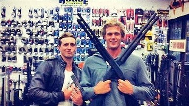 Comenta el periodista de un medio australiano :"Los dos se muestran sonrientes, sonteniendo en sus manos armas como las usadas en las masacres de Virginia Tech ( 32, 2007 ) y Port Arthur ( 35, 1996 )". O sea, una pistola y una escopeta de corredera.