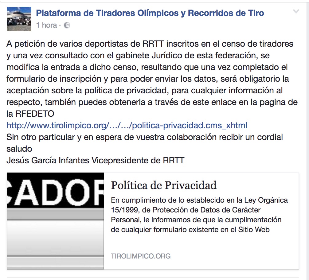 ACLARACIÓN SOBRE LOS COMENTARIOS EN EL FORO SOBRE SI LA ACTUALIZACIÓN DEL CENSO DE DEPORTISTAS DE RRTT QUE ESTA REALIZANDO LA RFEDETO A TRAVÉS DE SU PAGINA SE AJUSTA A LA POLÍTICA DE PRIVACIDAD.