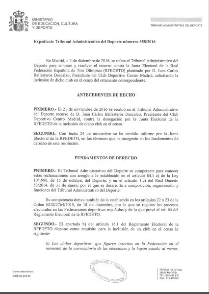 Y según se lee en la sentencia, el TAD indica que el recurrente ( El Club Deportivo Centro Madrid ) no acredita su participación en el Campeonato de España ( al uso de otros clubs; con equipo de tiradores ); sólo acredita la organización del evento. De haber acreditado la participación como equipo,estaría incluido en el censo.