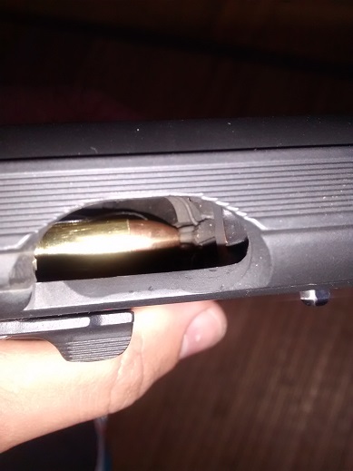 gracias por contestar coopy, de gran ayuda como siempre. ya localice el problema, me falta la causa. cuando la corredera empuja un cartucho a la recamara, en ocasiones el siguiente,que queda el primero en el cargador se mueve hacia alante medio centimetro, si liberas en ese momento el cargador, este baja unos 2 cms pero se queda trabado, tropieza contra el muelle del eztractor del cargador/ y tornillo del mismo, si tiras de el el cartucho se mueve hacia arriba en su parte delantera y sale. os pongo unas fotos...