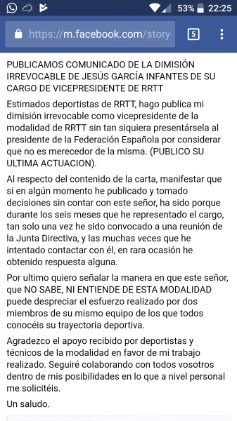 El señor García Infantes, a través de la Plataforma de Tiradores Olimpicos y Recorridos de Tiro, ha presentado su renuncia al cargo de Vicepresidente de RRTT en la Federación española.