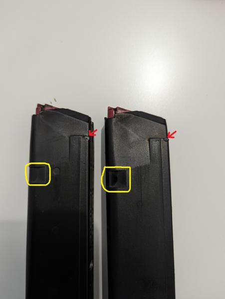 La holgura que tienes es porque la pieza que lo engancha, es la mitad de gruesa que la hendidura donde entra (en amarillo en la foto de arriba), y como el tope del cargador se ha ido desgastando pues baila hacia arriba y abajo. Por eso lo mejor es comerle la parte metálica de atrás que te comento en el punto anterior, por si lo metes demasiado que el cerrojo no choque.