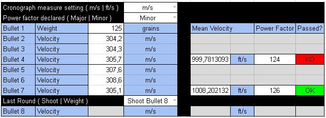 Como divertimento, he preparado una pequeña hoja de cálculo para comprobar el Power Factor tal y como establece el punto 5.6.3 ( Competitor Ammunition Testing Procedure ) del reglamento de IPSC