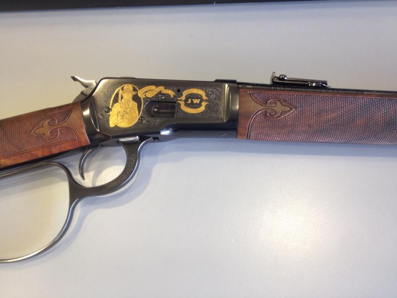 Armazon y palanca con grabados.Incrustaciones doradas con motivos y leyendas Jhon Wayne.