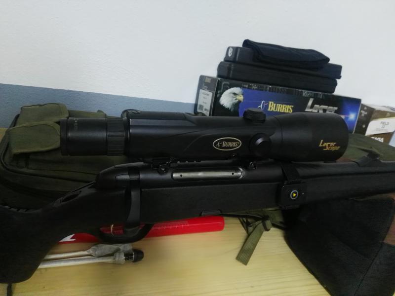 Lleva montado un visor de gama alta, Burris 4-12x50 Laser Scope, este visor lleva incorporado un telemetro laser, muy preciso, mide hasta una distancia de 1km, incorpora también mando a distancia inhalambrico para accionar el telemetro antes del disparo, mide en metros y yardas suficiente para el tiro más largo en un rececho, y baja hasta 4x aumento idóneo para las esperas. En mi practica, ningún animal escapo herido, todos parados en el sitio.