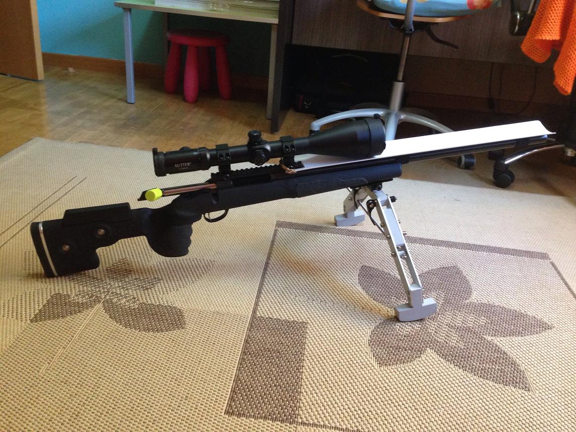 El bípode que se ve en las fotos es de fabricación casera pero funciona a las mil maravillas. Lleva un adaptador picatinny para su anclaje al rifle que sirve para los dos bípodes de la foto. Se cambia de uno a otro con un solo tornillo.