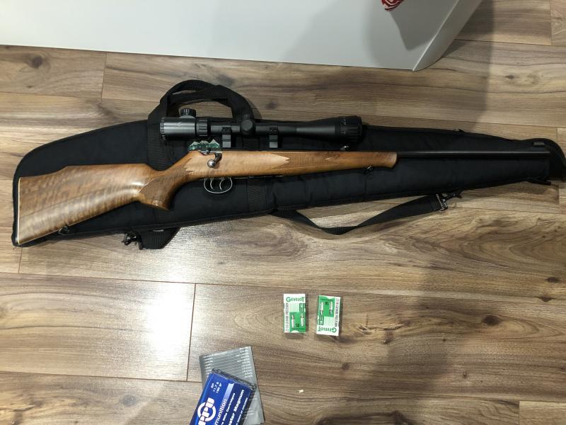 Anschütz 1415-16 22lr en perfecto estado por no decir como nueva, con gatillo al pelo, tiene una precisión magnifica, las maderas como el metal están perfectas. Soy el segundo dueño, comprada a un amigo que no la utilizó. Lleva montada un visor Arcea 6-24x40 y unas monturas Walther. La quito por cambiarme de campo de tiro y ahora tirar con calibre mayor.