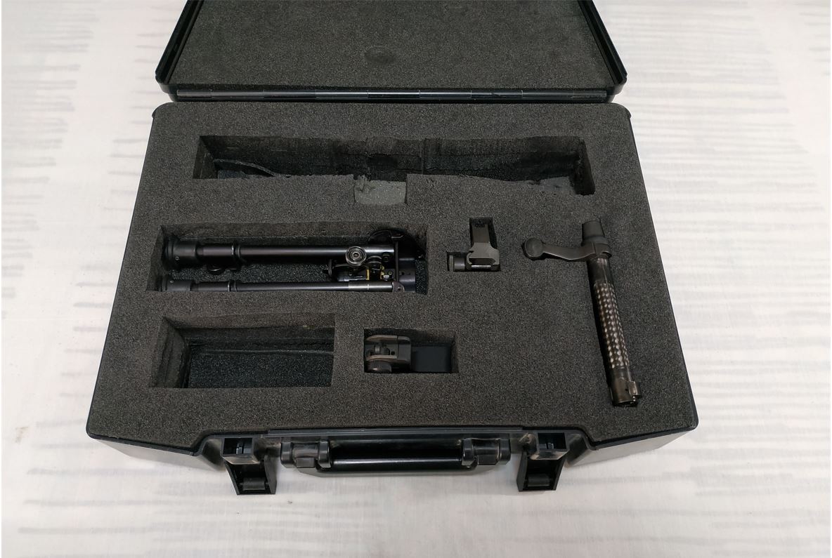 - Maletín rígido acolchado personalizado para los accesorios. En el maletín se pueden transportar: el cerrojo, el bípode Harris, las miras abiertas y un visor con su parasol.
