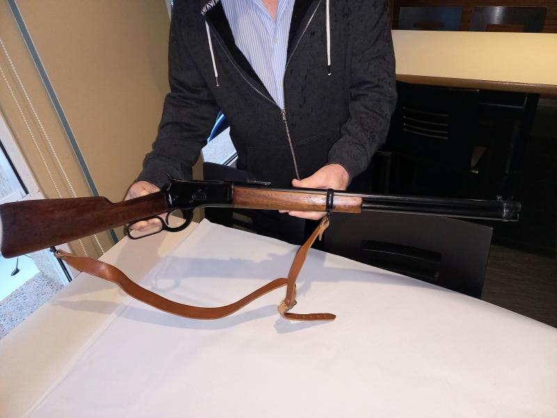 El arma en cuestión, participó en el rodaje de una película del oeste en la que está persona hizo de extra en los años 70, me falta el título de la peli pero lo pondré en cuanto lo sepa. La cuestión es que le gusto el winchester y consiguió que la productora se lo vendiera al finalizar el rodaje.