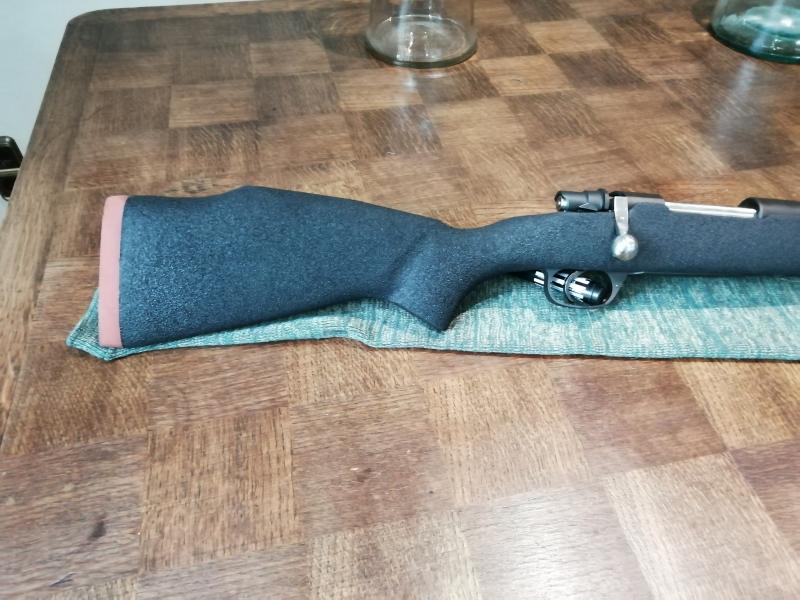 Va montado sobre una culata de madera terminada con pintura epoxídica, encame de resina en acción y guardamontes y cantonera Pachmayr Decelerator roja.