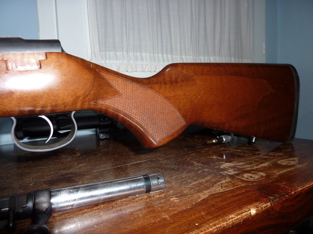 VENDIDA Tiene gatillo al pelo Frances, esta fabricada en el 2008, como se ve por los marcajes de cañón y cajón de mecanismos, pocos tiros, lleva incorporado un rail tipo Anschutz, y un punto de mira, (la he usado en mini F Class y en miras abiertas), muy buena precision, no se incluye el bípode ni el visor ni la anilla para la correa de tiro, solo la carabina, la muesca en la culata que se ve en la parte izquierda, es para poner un alza para miras abiertas, esta en Granada, a toda prueba, en el Campo de tiro de las Gabias.