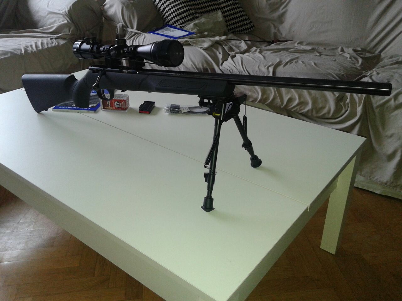 Hola compañeros!!! Muy a pesar mio vendo este magnifico rifle para Tiro de precision. Lo vendo por que tengo que hacer caja para otro juguete. El rifle se encuentra en Madrid y esta en perfectas condiciones a penas habre tirado un par de cajas. El rifle se vende tal y como esta en las fotos con visor y bipode. Para cualquier duda mi telf es 699574837 con wasat y mi nombre joaquin. EL PRECIO ES DE 400 E