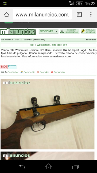 Hola a todos, no es por reventar la venta, cada uno puede vender sus armas por el precio que quiera, pero esta arma que vendes, Weihrauch HW 66 Match 222 REM, cuestan actualmente, 900€ en Suministros áyala lo podeis comprobar, y como muy cara en otras Armerias 1079€, pues para comprar algo que ya no tiene garantía, lo prefiero nuevo, de todas maneras mucha suerte con la venta, un Saludo. :cow: