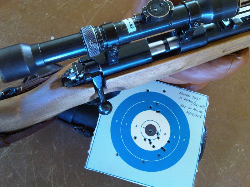 Gracias por los comentarios, la culata que traía la carabina, incluso después de lijarla y aplicarle aceite no tenia una buena textura, tuve que seleccionar otra del almacen del distribuidor y comprarla nueva para obtener el resultado esperado, pongo dos fotos de la culata antigua (ojo que lleva montado otro visor, no el que ofrezco ahora), asi podeis ver también como agrupa a 100 metros con un visorcillo de 4x....
