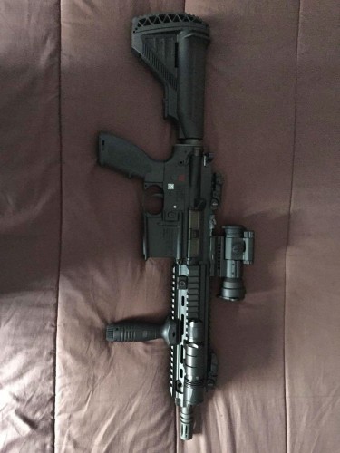 preciosa carabina HK modelo 416 cañon corto , calibre 22lr , se incluyen 4 cargadores 20 tiros , correa tactica 1 punto HK , protectores magpul rail picantilly , linterna tactica fenix tk 9 con anillo fenix para rail picantilly , grip delantero HK , miras originales fija hk , magpul asap para correa tactica , funda para transporte cordura con sus accesorios.