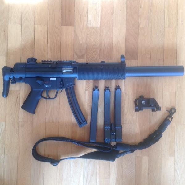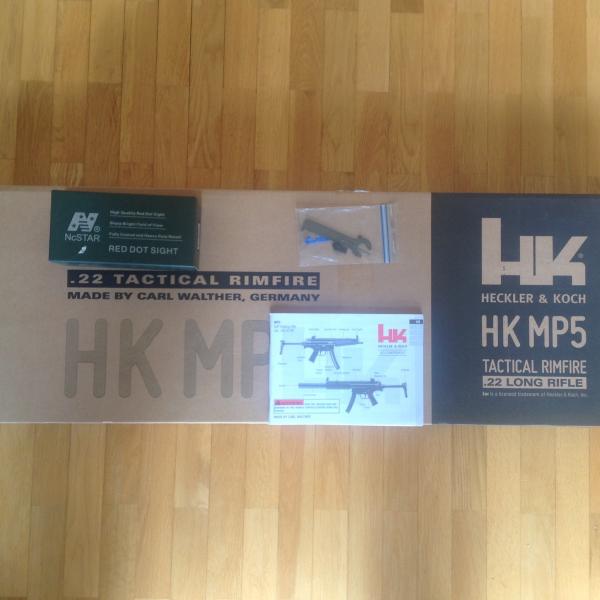 Vendo esta carabina con muy poco uso, se trata de una HK MP5 SD6 en calibre 22lr fabricada por Walther con licencia de HK, va con 4 cargadores de 25 cartuchos, 1 portacargador doble, correa tactica de 1 punto, carril y visor de punto rojo NcStar, en su caja original,con herramientas y manual de instrucciones